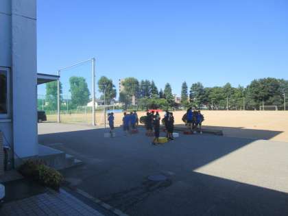 昨日より暑いので、日陰を使って練習したり、大型ミスト機を使って熱中症予防しながら活動しています。