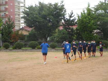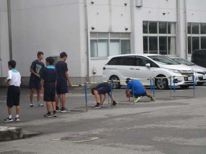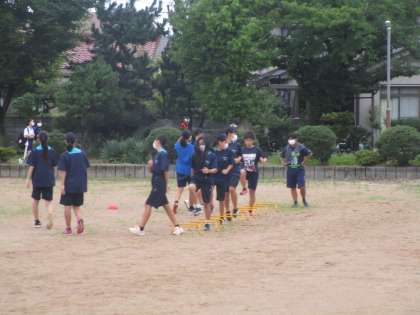 女子はミニハードル、男子はハードルくぐりで基礎トレーニングを頑張っていました。