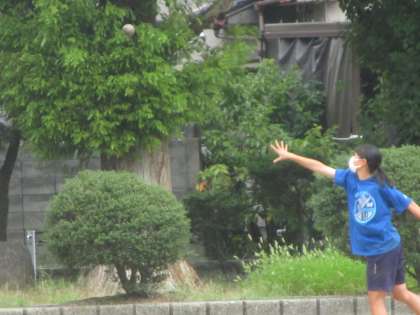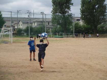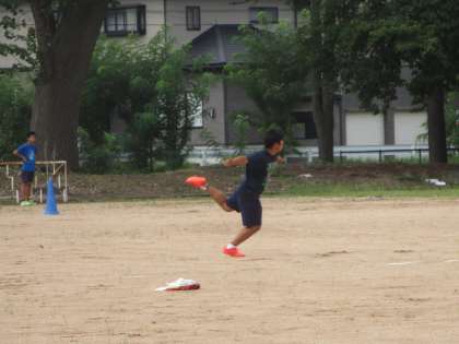 ボール投げ、砲丸投げ、円盤投げの練習の様子です。