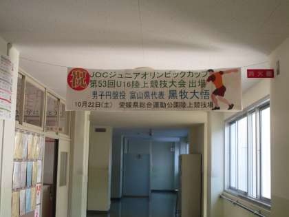 全国大会は終わりましたが、JOCジュニアオリンピック陸上競技大会県予選大会で標準記録を突破し、全国大会出場を決めた3年男子1名の横断幕が3年生廊下に掲示されました。進路に向けても頑張る時期ですが、文武両道で頑張ってください。