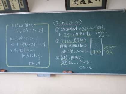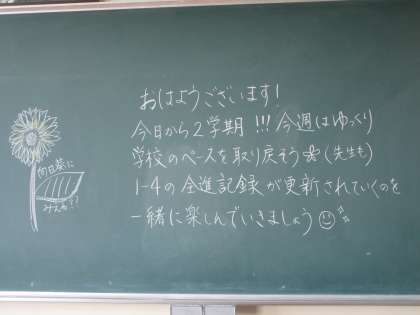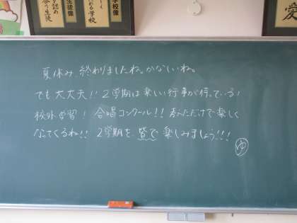 1年生の教室の黒板には、2学期スタートに向けて黒板に担任からのメッセージが書かれ、生徒を迎え入れました。