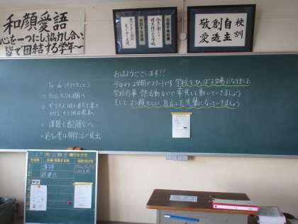 2学期のスタート、教室の黒板に担任のメッセージが書かれています。