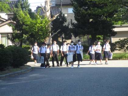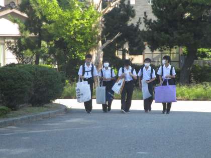 2学期がスタートしました 公開日 2022/08/29 更新日 2022/08/29 学校だより ぐずついた天候が続いていましたが、快晴のもと、2学期がスタートしました。いまだコロナも心配ですが、美術の作品を大きなバックに入れて生徒が久しぶりの友達との再会して笑顔で登校してくれました。 2学期、保護者の皆様、地域の皆様、ご支援、ご協力のほどよろしくお願いします。 私たち教職員も久しぶりに生徒と会えてうれしい気持ちです。