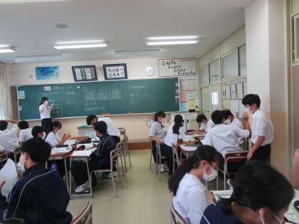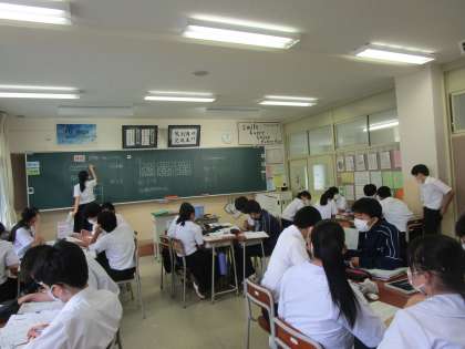 3年2組は、グループになり、問題にチャレンジしていました。各グループから代表の生徒が黒板に解答を書いていました。