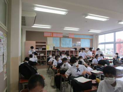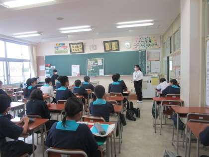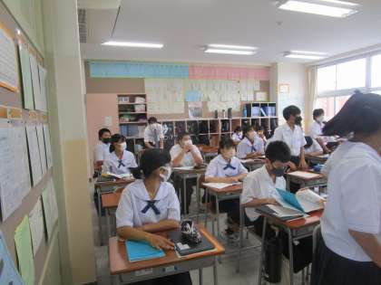 教育実習2日目、教育実習の先生が終学活の進め方を勉強していました。終学活の進め方を見学したり、メモを執ったり、終学活の先生からの話をしてみたりと3週間の実習を有意義に過ごしています。実習生の皆さん、3週間頑張ってください。