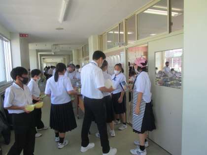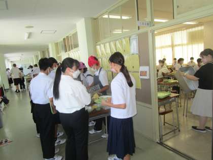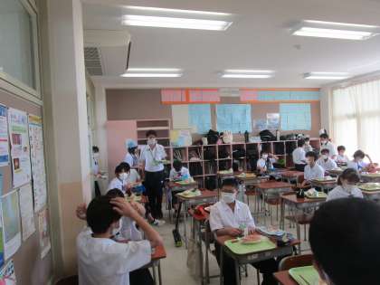 教育実習生が頑張っています 公開日 2022/09/05 更新日 2022/09/05 学校だより 給食の時間、教育実習の先生が、給食の準備と生徒と一緒にしたり、生徒と会話しながら準備の手伝いや指導、見守りをしてくれていました。