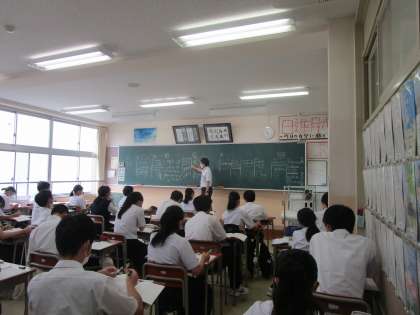 3年1組の数学は、生徒が黒板に書いた解答について先生が解説をしていました。