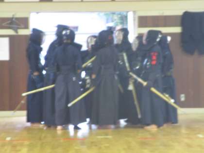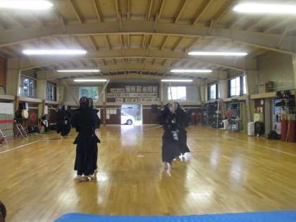 剣道部が武道館いっぱいを速い足裁きで動いていました。部員が集まり、確認しながら練習していました。