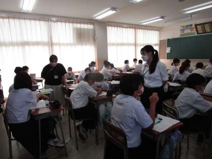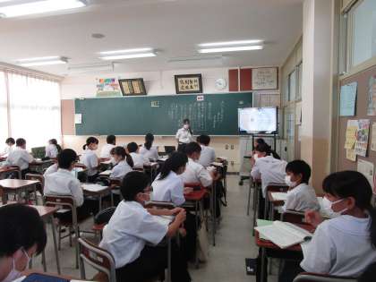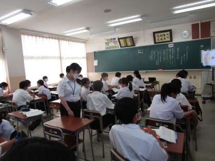 教育実習の先生が頑張っています 国語 公開日 2022/09/12 更新日 2022/09/12 1学年 1年5組の国語は教育実習の先生が授業をしていました。グループでの話し合いを巡回しながら、アドバイスしたり、確認したりして学習内容の定着を図っていました。