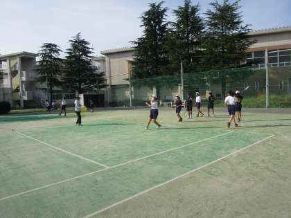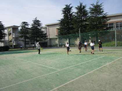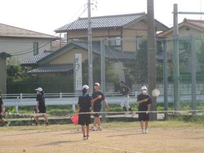 大会に向けて顧問の先生が球出しをし、どんどん相手コートに打ち込んでいます。