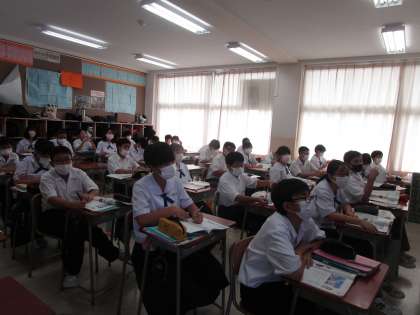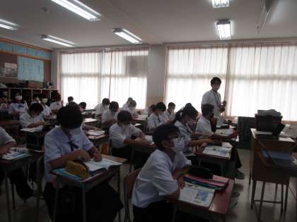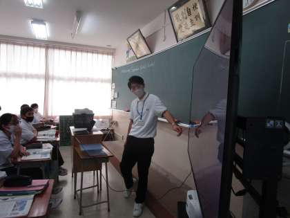 教育実習の先生が頑張っています 英語 公開日 2022/09/14 更新日 2022/09/14 1学年 9月14日(木) 1年5組の英語は教育実習の先生の授業でした。新しい単語の説明や発音を先生と一緒に練習していました。