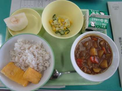 本日の給食は、麦ご飯、カレールウ、卵ロール、コールスローサラダ、梨、牛乳でした。