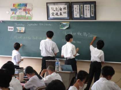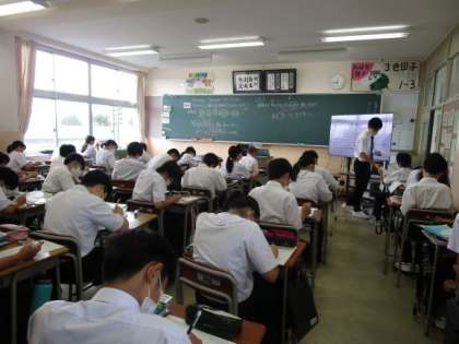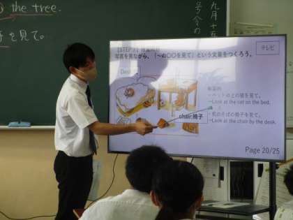 「ものや人の場所を説明できるようになろう」という課題で英語の授業がありました。授業の後半では、先生が撮ってきた写真を見ながら「〜の○○を見て」という文章を、班で協力しながら作っていました。