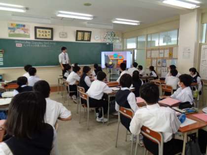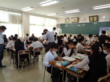 教育実習生の研究授業です。たくさんの先生が参観しました。生徒も意欲的に取り組んでいます。