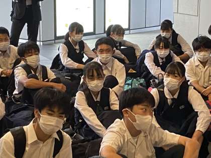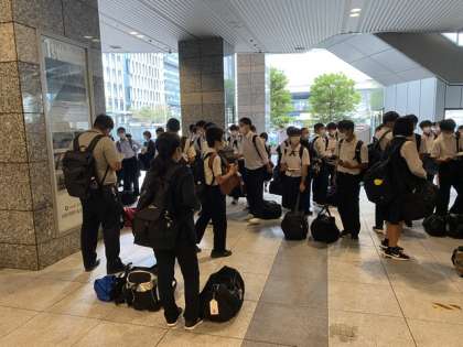 朝食を食べ終わり、コース別に集合しています。 少々疲れ気味の表情です。