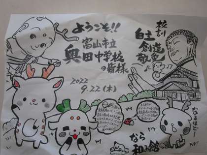 疲れた心と体を癒やしてくれたのが、昼食会場のすてきなちょっとしたおもてなしでした。手作りの紙のランチョンマットでした。ホームページで調べていただいたのか、校訓が書かれていました。みんな大喜びでした。近くの女子生徒が余った時間で色を塗り始めました。時間の関係で全部は塗れませんでしたがいい思い出になったことと思います。すてきなおもてなしありがとうございました。一生の思い出となることでしょう。