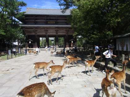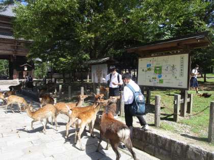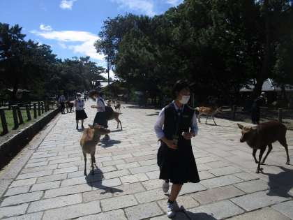 3学年修学旅行3日目 奈良公園にて 公開日 2022/09/25 更新日 2022/09/25 3学年 奈良公園と言えば、やはり鹿ですかね。東大寺を見学した後、鹿のえさやり体験をしました。鹿に追いかけられて逃げ回る生徒や歓声を上げる生徒、鹿の食いつく迫力に驚く生徒でした。