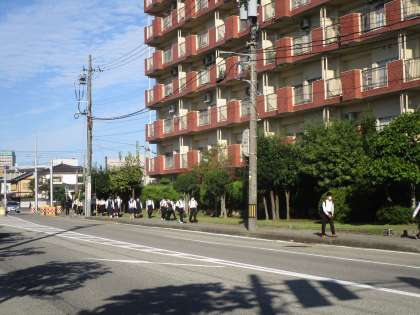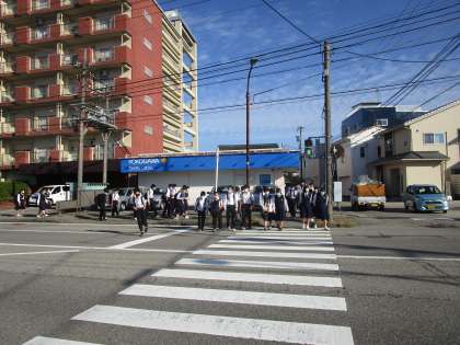 秋の交通安全運動期間中です。生徒がライトレールや徒歩で奥田中学校前の横断歩道を渡って登校しています。奥田中学校前の横断歩道は登校時、優先して青信号になりますが、時間が短いです。右折の車もおり、安全に早めに横断してくれています。
