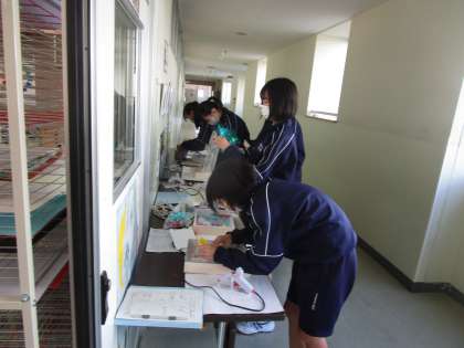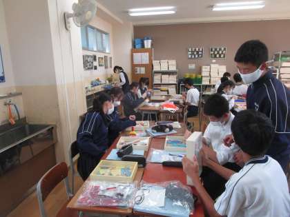 3年6組 美術 公開日 2022/09/29 更新日 2022/09/29 3学年 3年6組の美術は、アッサンブラージュの作品の完成間近でした。いろいろな小物を箱の中に並べたり、取り付けたり頑張っていました。