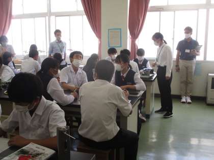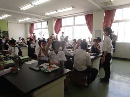 アットホームな2年2組の雰囲気が伝わってきました。ちょっと緊張気味でしたが。挙手したり、先生の問いかけに答えたり、生徒も頑張ってくれていました。