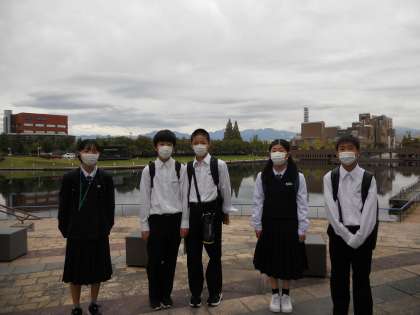 環水公園での写真です。橋の下にはおもしろい写真スポットがありました。 どの班も仲よく活動を進めています。