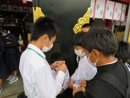 校外学習 日枝神社 公開日 2022/10/06 更新日 2022/10/06 1学年 午後の活動です。拝殿前に6つの班が集まり、合同で質問会を行いました。神主さんが一人一人の質問に丁寧に答えておられました。凜とした境内での質問会とあって、とても新鮮みのあるものでした。