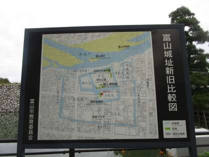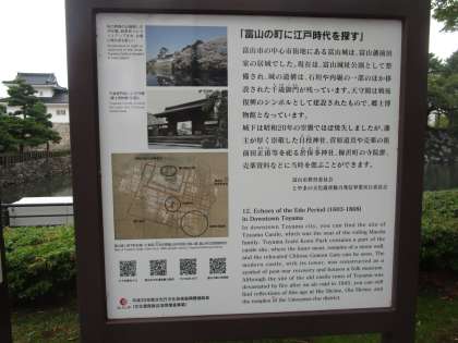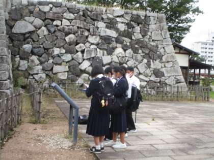 富山城を見学した生徒が説明の掲示板を読み、しおりに一生懸命メモしていました。スローガンの通り、富山市の魅力をしっかり探究していました。