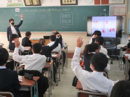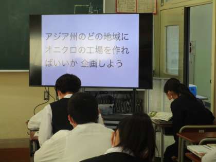 1年5組 社会 公開日 2022/10/13 更新日 2022/10/13 1学年 4限の社会では、「アジア州のどの州にオニクロの工場をつくれはよいか、企画しよう」という課題で話し合いました。オニクロというある架空の企業を設定し、アジアを取り巻く地理的な諸要素をもとに、自分なりの企画を立て、意見を出し合いました。生徒は教科書や資料を見ながら、じっくりと考えていました。