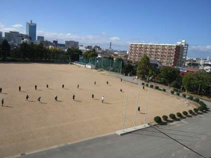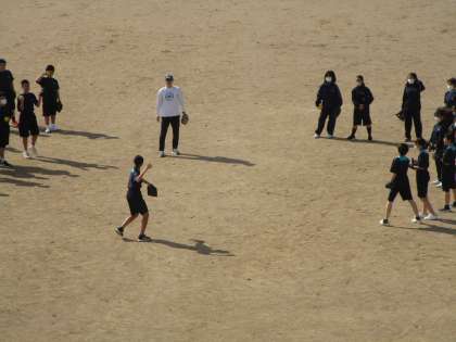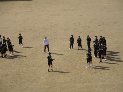 1年4組 保健体育 公開日 2022/10/13 更新日 2022/10/13 1学年 10月13日(木)5限 中間考査も終わり、午後は暑いくらいの陽ざしの中、グラウンドで1年4組がソフトボールの学習をしていました。ゴロの取り方のいい例と悪い例を見て、よりよい取り方を確認していました。ペアになり、ゴロの処理の仕方を学習していました。テストも終わり、ほっとしたのか和やかな雰囲気で活動していました。