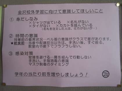 11月1日の2年金沢校外学習に向けて 公開日 2022/10/14 更新日 2022/10/14 2学年 11月1日の2年金沢校外学習に向けて、学年主任の先生より意識してほしいことが開示されていました。学年の当たり前を増やして思い出深い金沢校外学習になるよう準備しましょう。