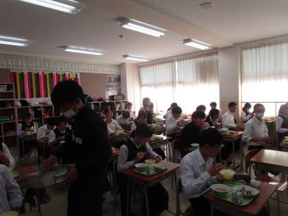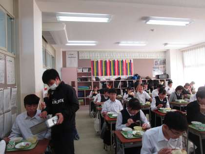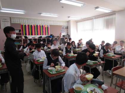 全校で一番準備が早く、残食が少ない3年生のクラスです。給食準備が毎日の習慣で早く準備することが当たり前になっています。おかわりする生徒に担任の先生が笑顔で配ってくれていました。