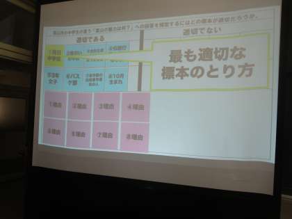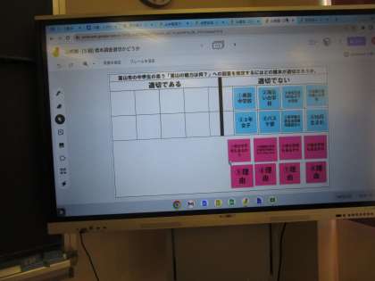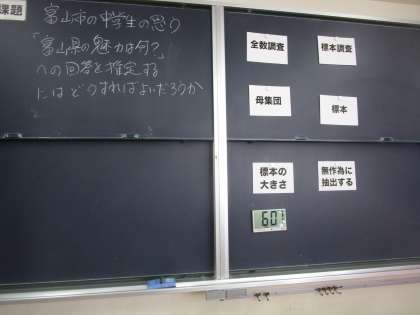 北陸四県数学研究大会 3年5組数学 公開日 2022/10/21 更新日 2022/10/21 3学年 3年5組の研究授業は、富山市の中学生が思う「富山県の魅力は何?」への回答を推定するにはどうすればよいかについて学習を深めていました。