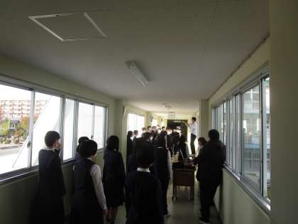 渡り廊下での練習の様子です。横に広がれ、窓越しに声を飛ばしています。