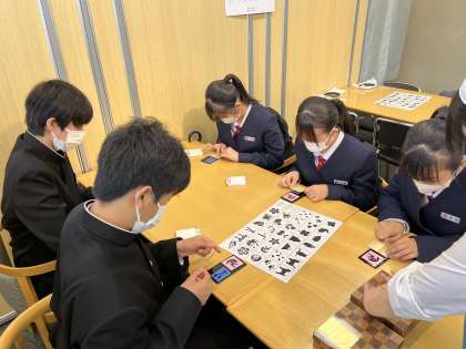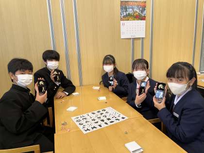 物産館で金箔貼り体験をした班です。好きな絵柄を選ぶことが出来ますが、班員みんな同じデザイン!息ぴったり仲良しです!