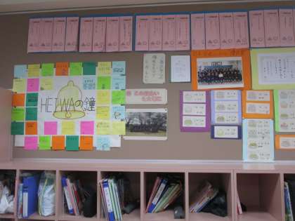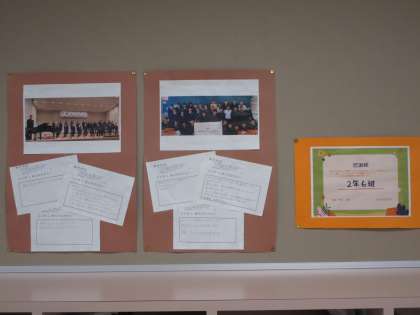 2年生のクラスの背面掲示板に賞状や講評、写真、担任のねぎらいの言葉などが掲示されています。