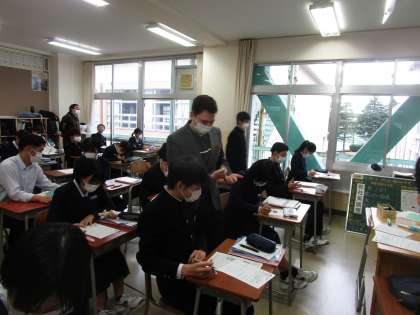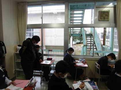 3年3組の英語は生徒が考えた英文を先生とALTの先生がチェックし、ハンコをもらっていました。