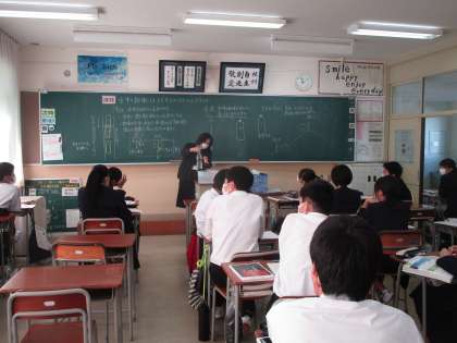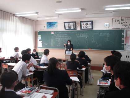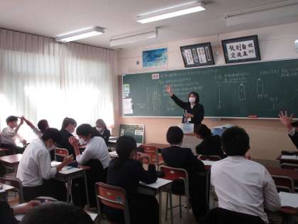 3年2組の理科は、「水中の物体にはどんな力がはたらくのだろうか」という課題で学習していました。ペットボトルを使って先生が水圧の実験を見せて確認していました。