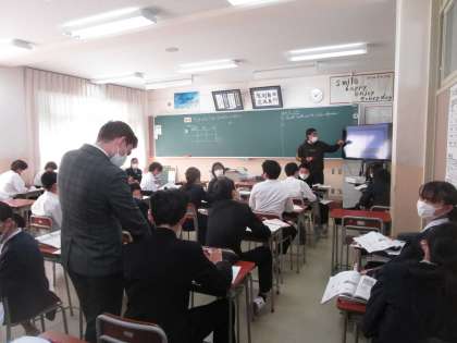 3年2組の英語は関係代名詞を学習していました。プリントを使って、ALTの先生も巡回しながらアドバイスしていました。