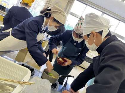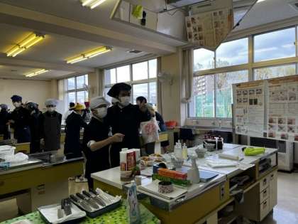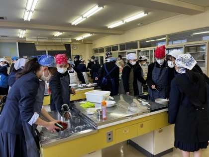 1年4組 家庭科 公開日 2022/11/14 更新日 2022/11/14 1学年 家庭科の授業で、調理実習をしていました。 鯖の味噌煮を、1人1人の役割を果たしながら協力して作っていました。 掲示物の工程表を見て、作り方を確認する姿もありました。 美味しそうな香りが広がっていました。