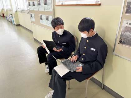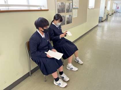6限の英語では、ALTの先生とスピーチのテストをしていました。 順番待ちの廊下でも、練習を頑張っていました。