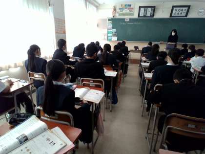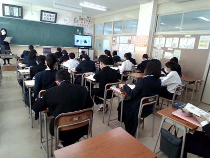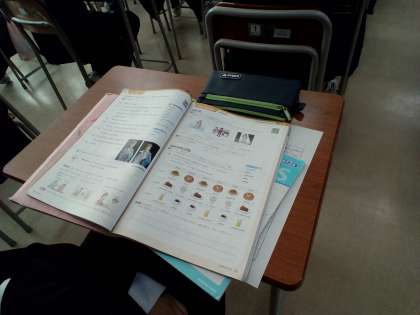 中間考査に向けて、みんな真剣に勉強しています。教科書のリスニング問題に取り組んでいる写真です。