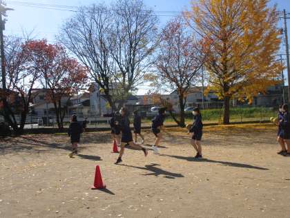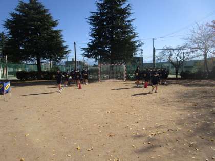 2年1組、2組女子の保健体育はハンドボールコートでシュートを練習していました。さわやかな天候で気持ちよく運動できました。いちょうの葉を踏みしめながらハンドボールを楽しんでいました。