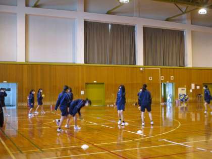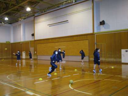 ハンドボールの練習をしています。 2人でパスを繋げて最後にシュートを決めます。