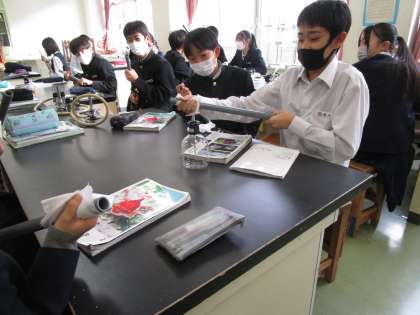 静電気を発生させる実験をしています。 パイプをこすると箔検電器が動き歓声が上がっていました。