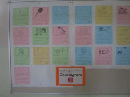 2年生の英語で「最近行った場所、うれしかったこと、ワクワクしたこと、私のおすすめ」を発信しようというテーマで学習しました。インスタグラム的にオクスタグラムとして掲示板に掲示されました。どんな発信されているかぜひ見てみましょう。