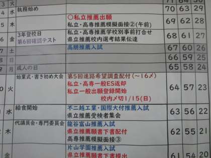 1日1日を大切に 公開日 2022/12/08 更新日 2022/12/08 3学年 3年生は確認テストに挑んでいます。教室や廊下に掲示してある進路カレンダーを見ると 卒業まであと68日、県立一般入試まであと61日、私立入試まであと27日だそうです。 1日1日を大切に次のステップに向けてステップアップしてください。