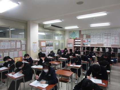 3年生確認テストに挑む 公開日 2022/12/08 更新日 2022/12/08 3学年 12月8日(木)1限 3年生が確認テストに挑んでいます。1限は社会のテストです。毎週のテストでハードスケジュールでしたが、次回は1月6日です。このあと、冬休みじっくりもう一度学力アップを図りましょう。お疲れ様