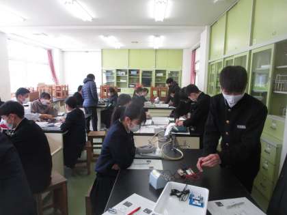2年5組の理科は電圧について学習していました。理科室で実験しながら確かめていました。