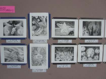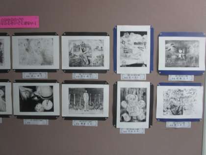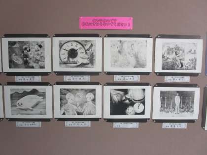 1階美術室前に2年生の美術作品ドライポイント版画が20点ほど展示されています。