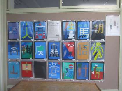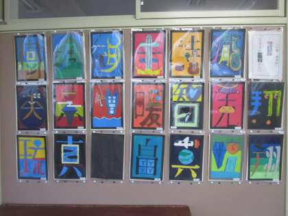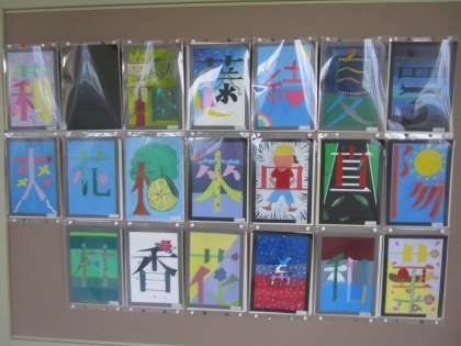 1年生の教室前の廊下の掲示板に絵文字の作品が展示されています。ぜひご覧ください。